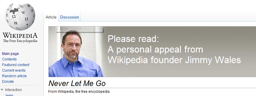“Please read: A personal appeal from Wikipedia founder Jimmy Wales Never Let Me Go From Wikipedia, the free encyclopedia”