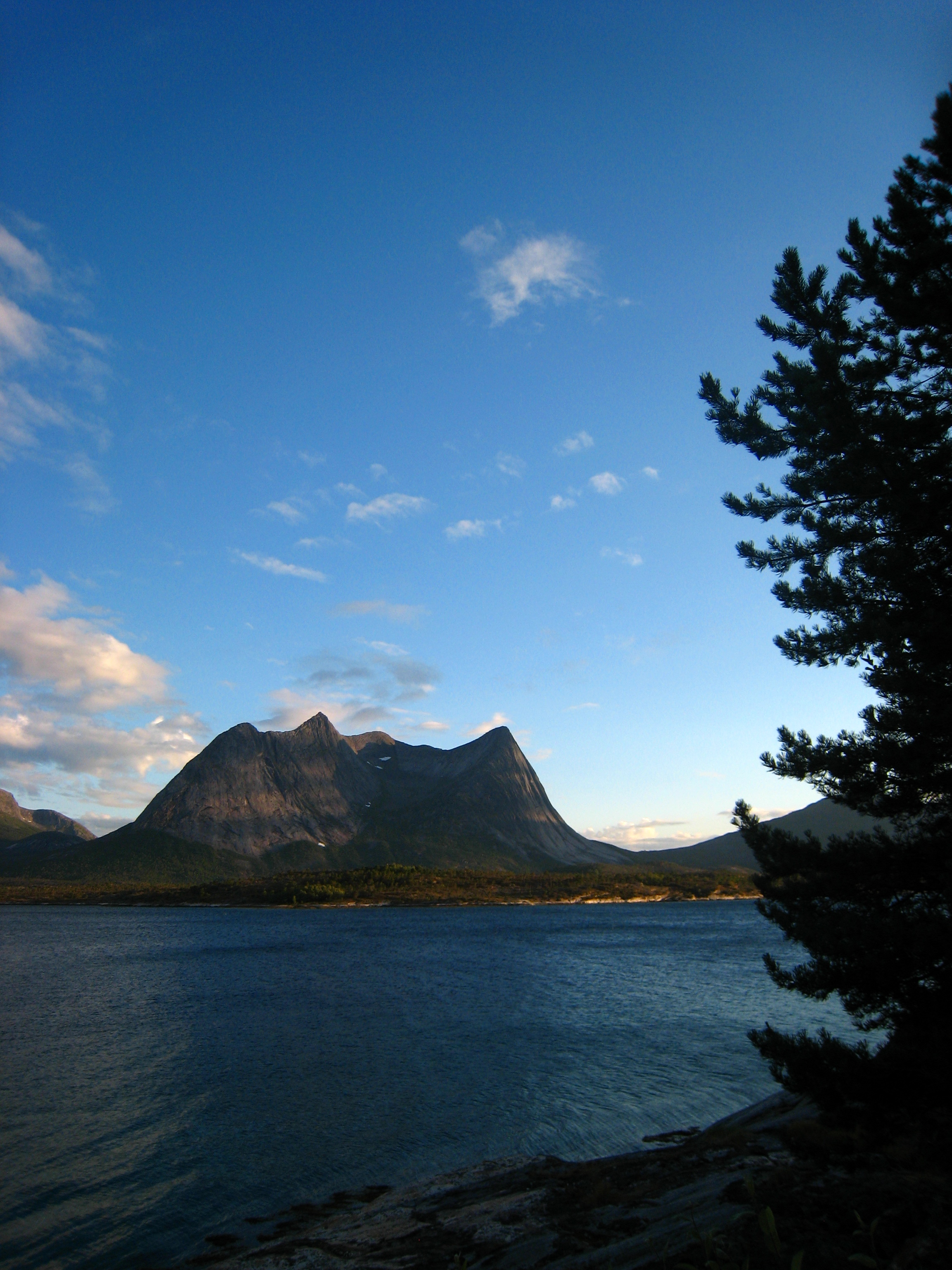 From left to right: Teppekiltinden (665 m), Buskardet, Rundtinden (798 m), Valletindan and Breiskardtinden (883 m) with Efjord in the foreground. To the right is a Norwegian-Russian Scotts Pine (Pinus sylvestris) - a species of trees that has been here since the last ice age about 10.000 years ago.