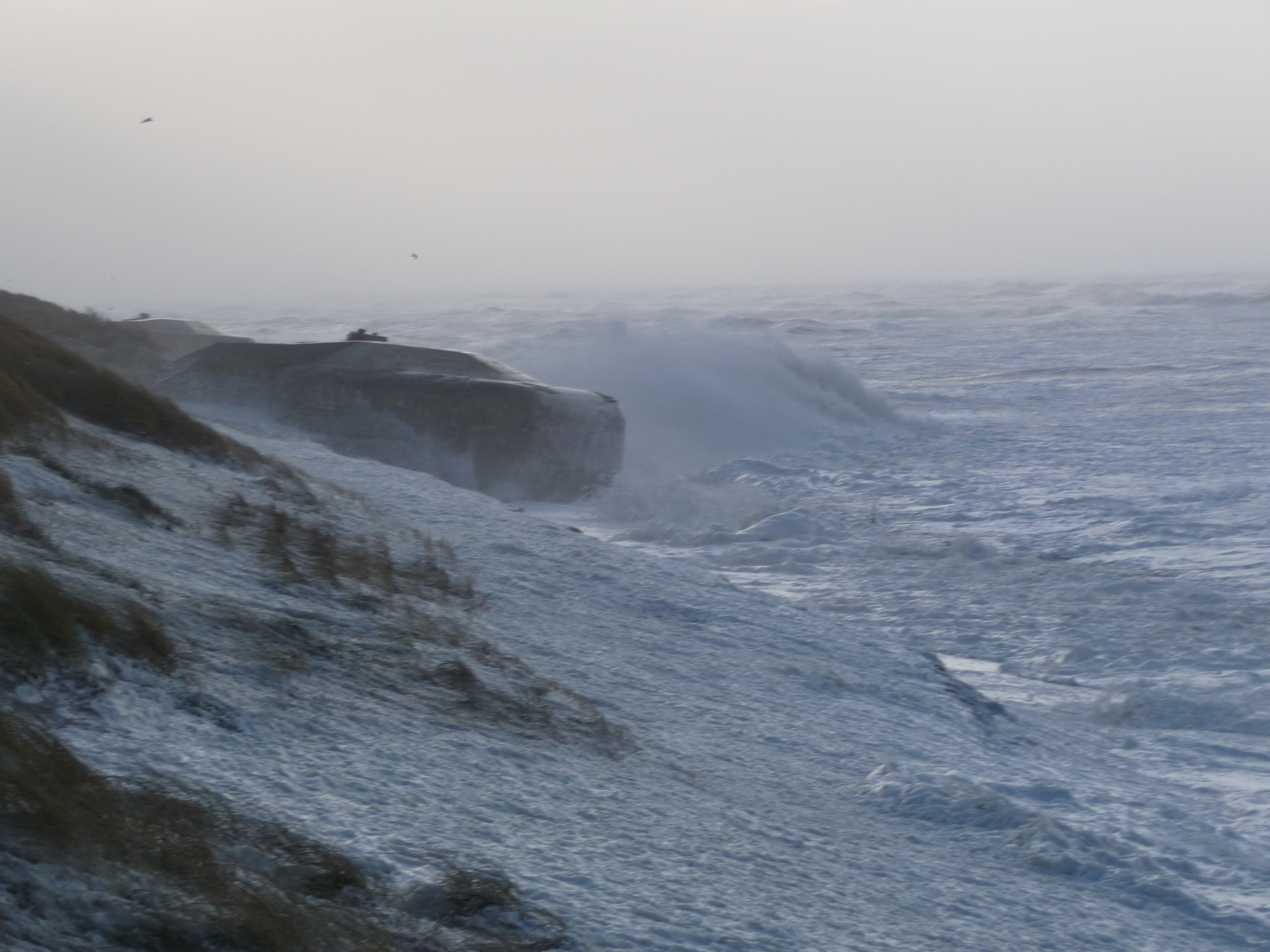 I flew from Denmark to Northern-Norway on Thursday. That was just as a heavy low pressure weather system moved in from the West. And it hit the coastline of the two nations with extreme force. All the way up in the jet-stream where we flew at 32,000 feet, the turbulence could be felt all the way to the North. My friend Ole spent some time by the West Coast of Denmark in his cottage. He reported a real heavy shaking in the cottage as the storm gusts hit. But no harm was done. Ole graciously lent me this picture from the storm of 9th of December.