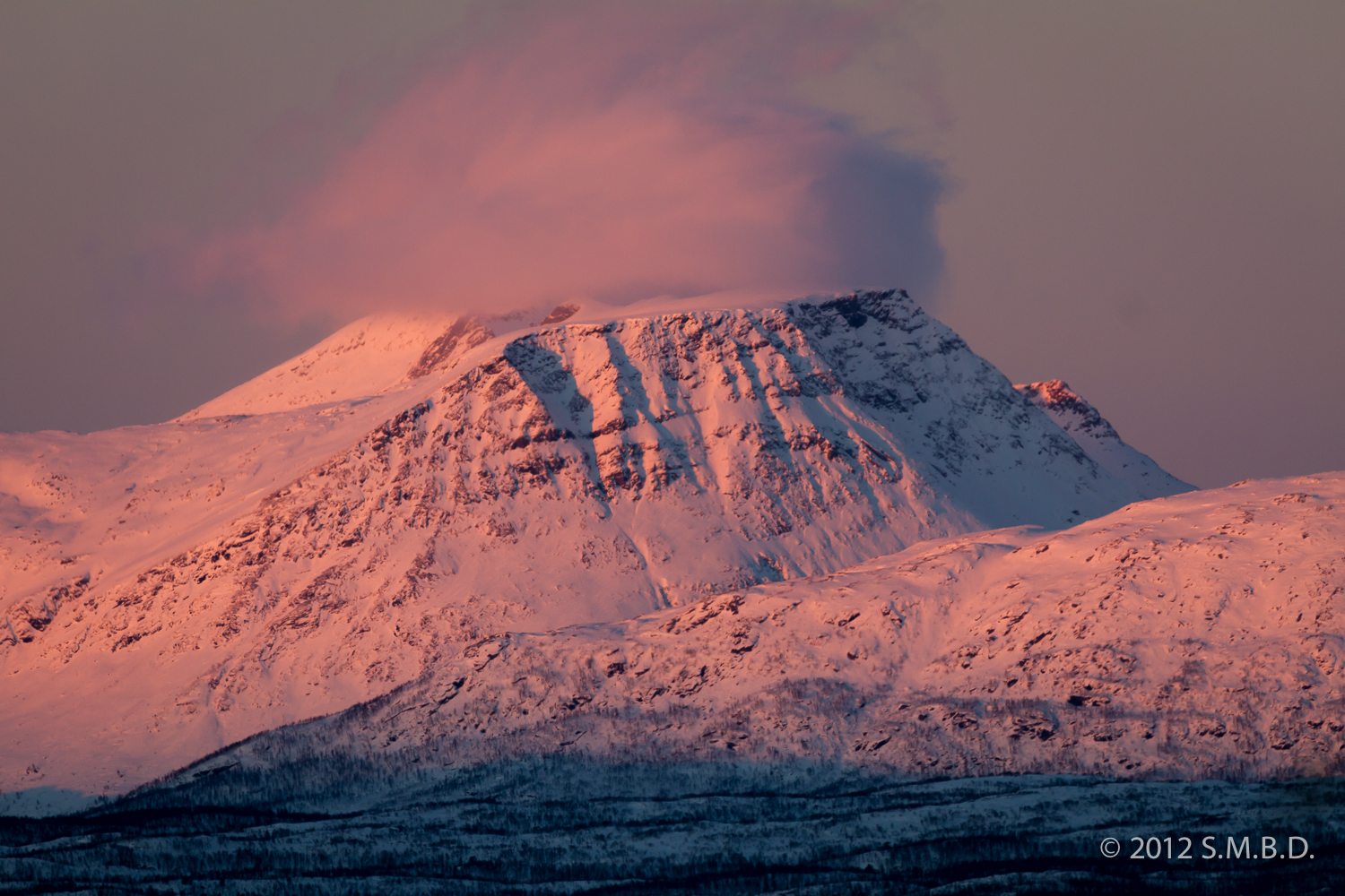 Even now the sun is setting early. This photo of reflections in the snow-covered mountains from sunset was taken 15:58 today.