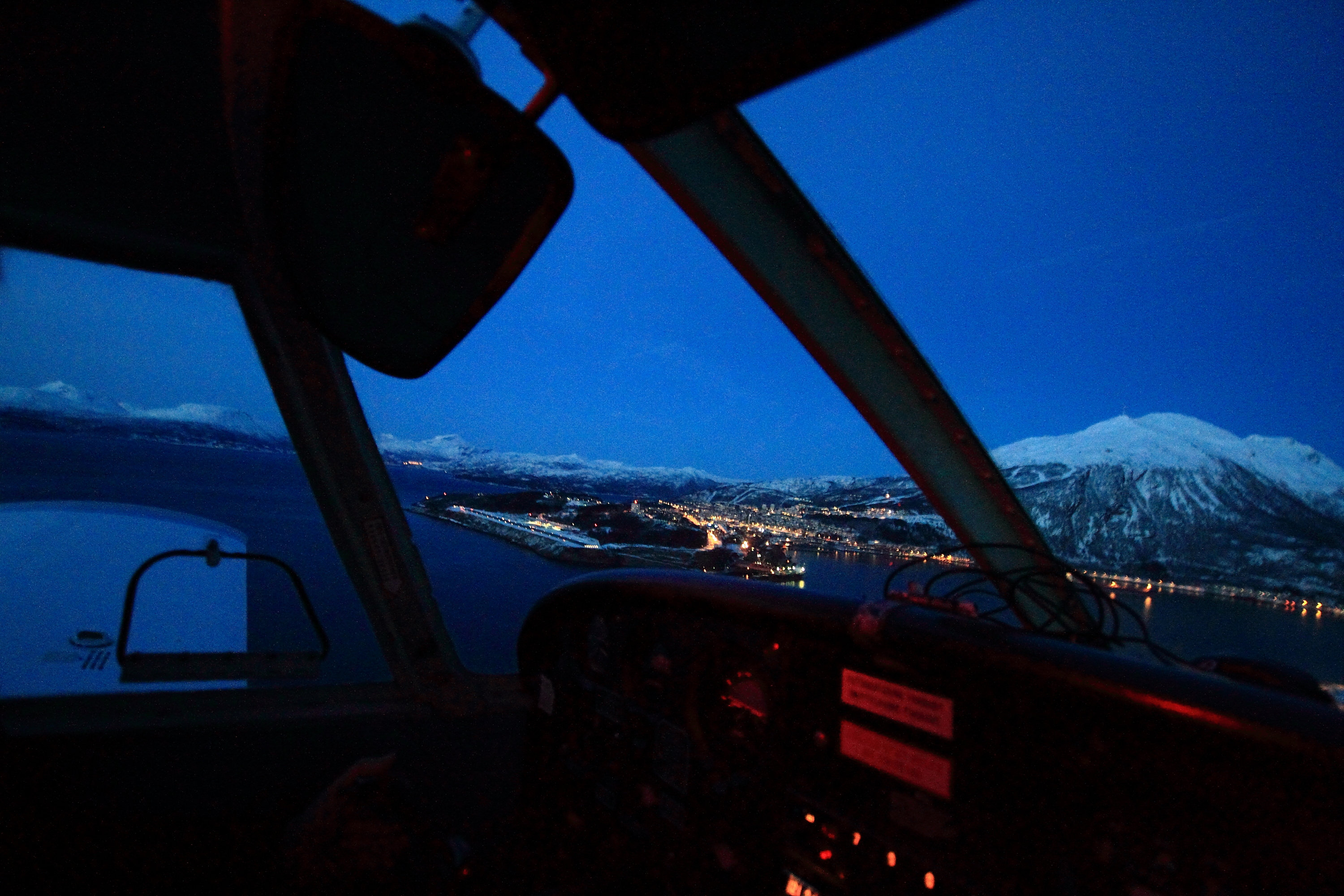 In the capable hands of Captain Utnes I had the rare and beautiful chance of finally get some air under the wings! A short, but lovely flight this evening. Calm weather and few clouds was the setting of seeing the city of Narvik from above with the city lights. Usually that is just passing by in a few seconds coming in or going out by the commercial flights. Howering in a small Piper Cherokee over the city gives a very different feeling and gives quite a different feeling than the “glorified busrides” a commercial liner has to offer. And when flying together with a pilot with 30 years flying experience is also a treat. Seeing how he reads his instruments, trims the plane and handles it by the book and more is a brilliant experience. And kudos, exactly when the rear wheels touched the runway the stall light gave a short indication. That is the hallmark of a perfect landing and usually says quite a lot about good piloting! More pictures will be published as I have a chance to process them.