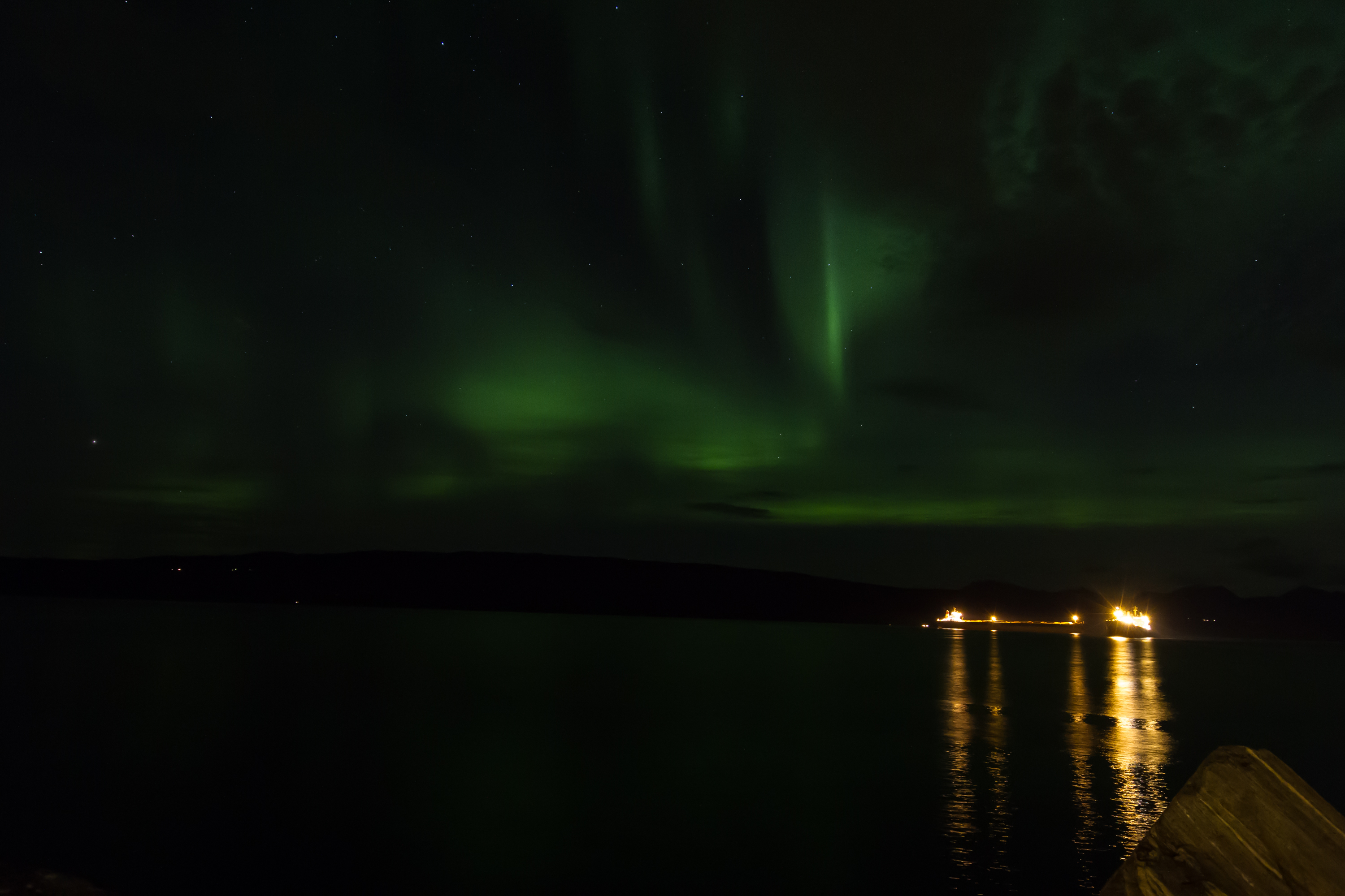 Tonights Northern Lights (Aurora Borealis) reflected in the Ofoten Fjord with a couple of iron ore bulk carriers at anchor waiting for service.