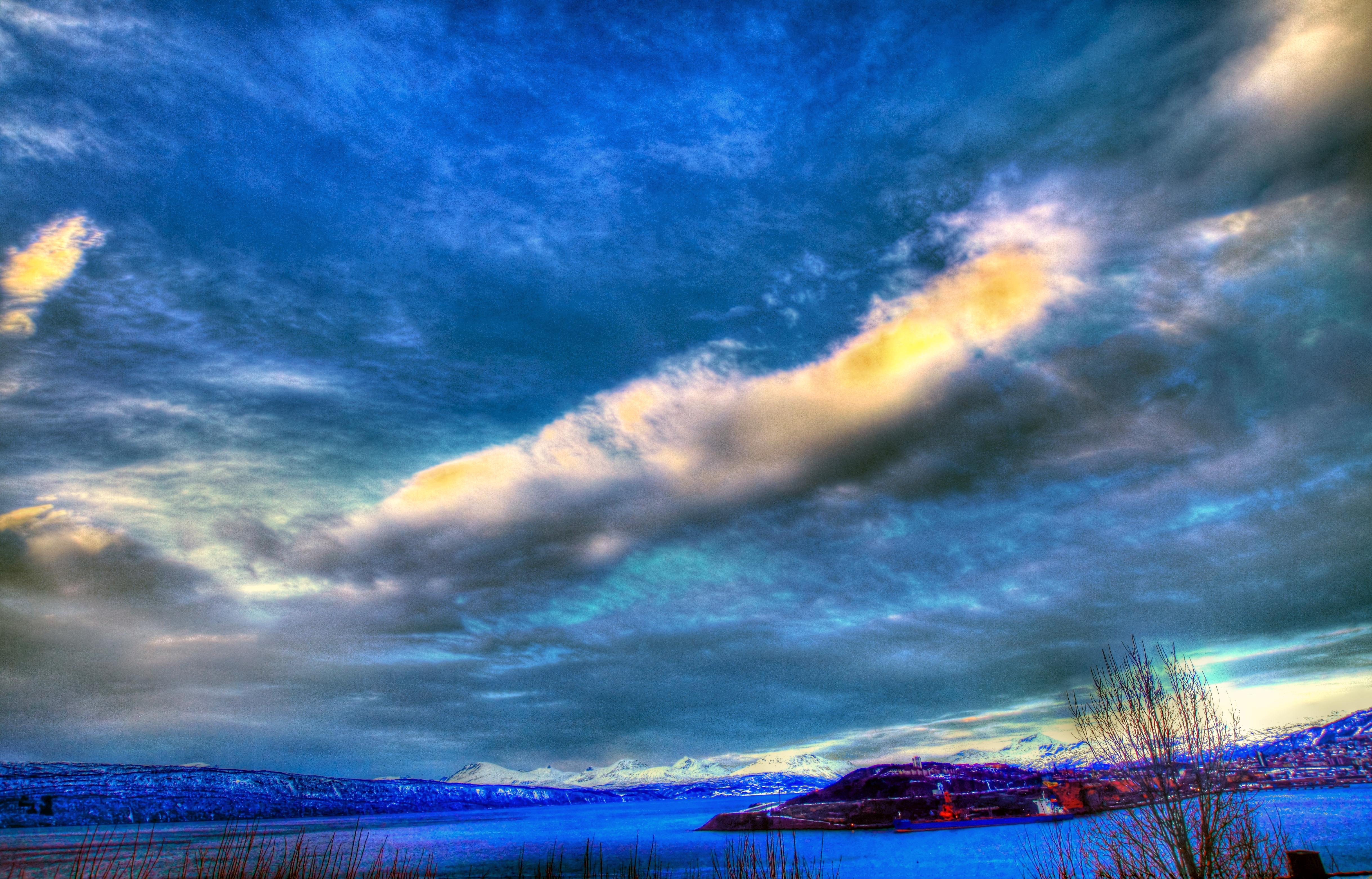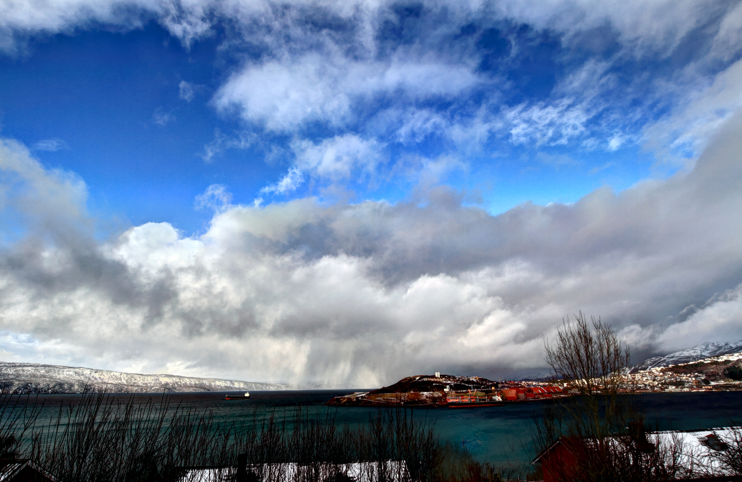 Yesterday I made this HDR from 9 exposures of a snow shower moving through the Ofoten Fjord. Lovely contrasts!