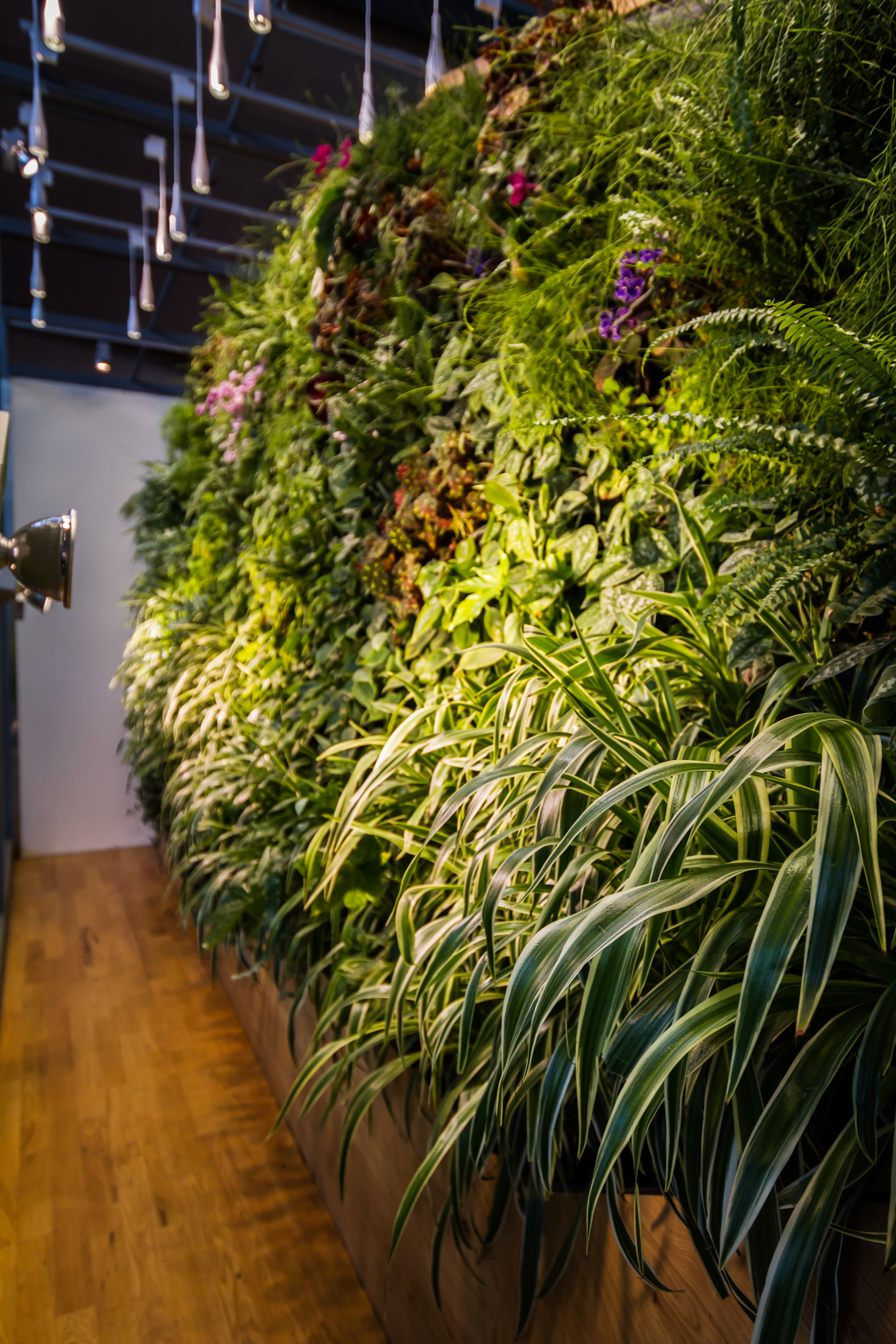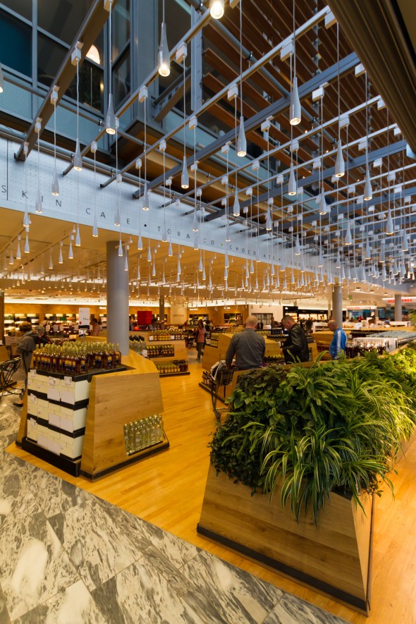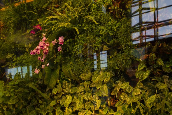 I observed the gardeners as they planted these beautiful “hanging gardens” with the most amazing plants and flowers earlier this summer. At a later visit I took the opportunity to take a few shots (with my camera, not from the contents of the shelves) of this architectural Pièce de résistance. And all the shelfs are actually made out of solid wood. A rarity in this politically correct IKEA-age. The ceiling of elegant lamps form waves of light resembling northern light, and the shapes of the shelf-modules draws your attention to the steep mountains in Norway.