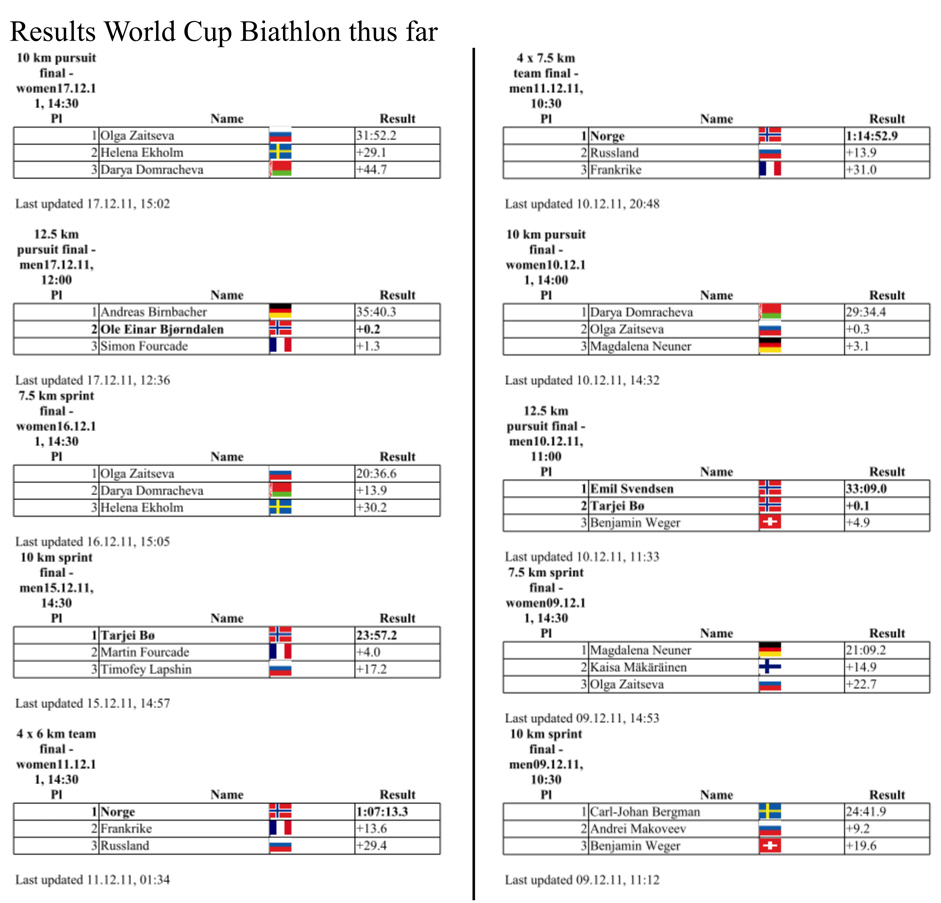 Like I’ve mentioned earlier – BITAHLON is the GREATEST sport on the planet – at least to my estimation! And what a fantastic week it has been! The Norwegian biathletes has taken one top place after the other. And fantastic achievements all around. Tomorrow is the last race before Christmas. A mixed team race.