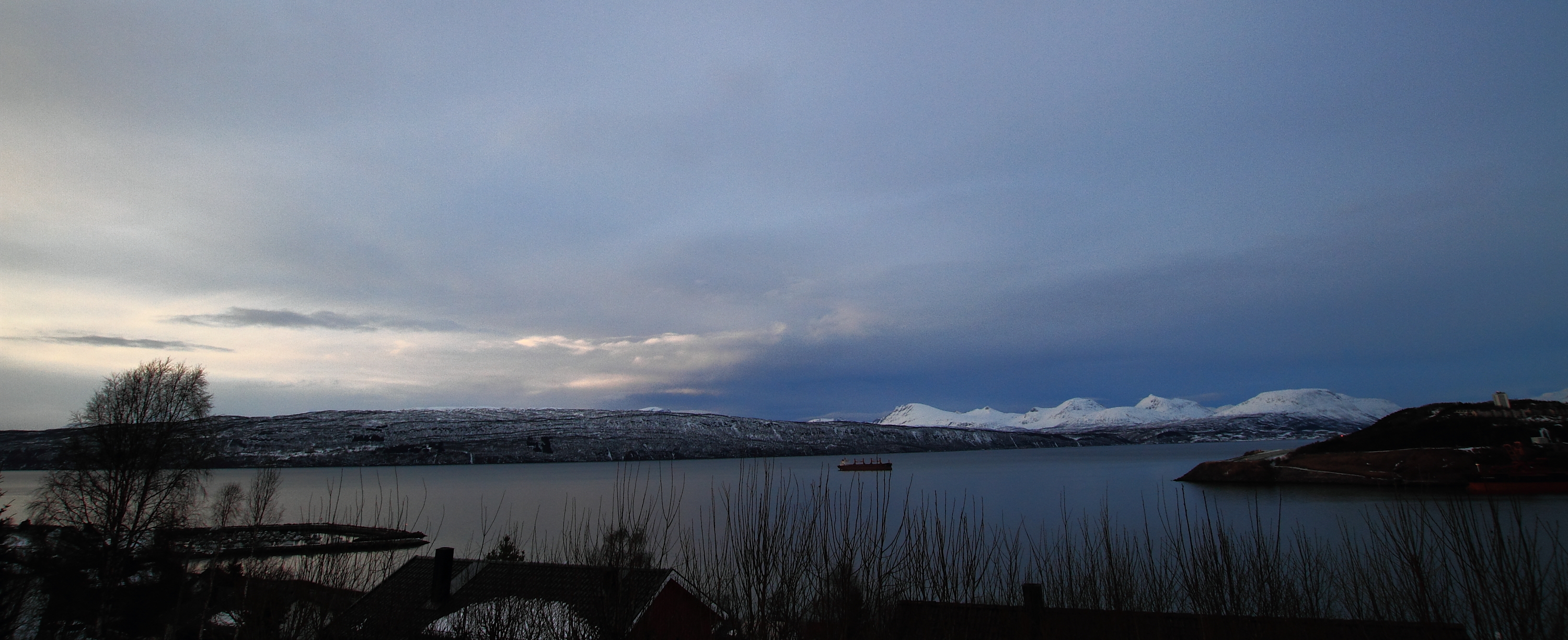 Snow showers coming in the Ofoten Fjord – Eibhlin of Panama is being loaded at pier 5